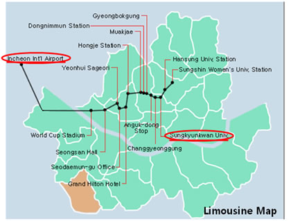 >Take airport bus #6011 at stops #5B or #12A on the 1st floor of the airport. The airport bus runs every 20 to 30 minutes and it will take almost two hours to get to Sungkyunkwan University (SKKU, Seoul). It will charge you KRW 9,000 won. Before getting on the bus, please purchase the ticket or pay the cash to the driver.