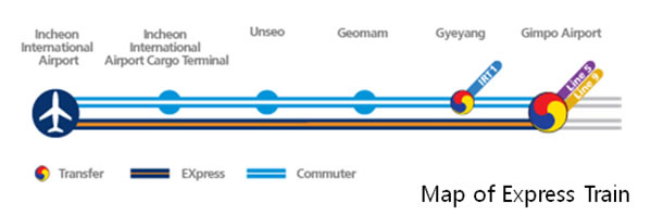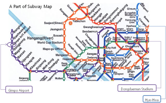 >First you will get on the express train to the Gimpo Airport station. It will cost 3,200 won and take about 30 minutes. At the Gimpo Airport station, you will transfer to the subway on the violet line (or Line 5) to the Dongdaemun Stadium station to transfer again to the blue line (or Line 4). It will cost 1,300 won and take about 60 minutes to get to Hyehwa station on the blue line, which is the nearest subway stop to SKKU.