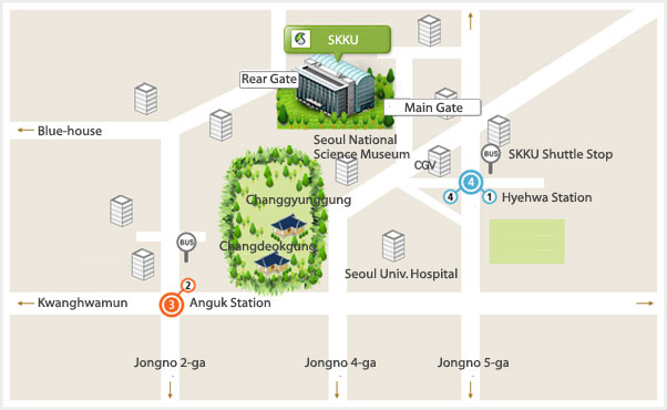 >On Foot: You will move to the exit 4 and walk along the Daemyeong Geori. You will cross the street and go into the road which begins at "Dunkin Donuts." By Shuttle: At exit 1, you will find the green SKKU shuttle stop. The shuttles information below.