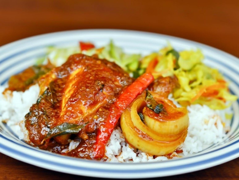 Coconut cream and milk are the key ingredients of this luscious and delectable sauce, perked up by a blend of chilli, ginger, turmeric, shallots and garlic. A whole chicken is cooked and slathered in the relish, with lemongrass adding a citrus tone to the union of flavours.