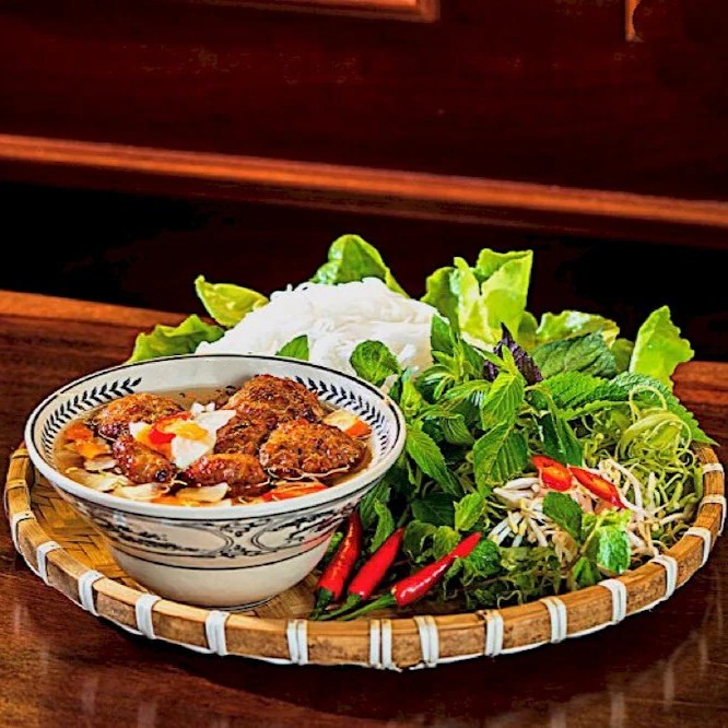 Different from pho, the broth of banh da cua is made from freshly pounded small crabs, which creates the natural sweet flavour of seafood for this dish. Normally, banh da cua consists of toppings such as meatballs, sausage, ground meat wrapped with betel leaves, fried tofu, and fresh herbs. Lime wedges, lettuce, perilla leaves, and sliced chilli peppers are available for diners to add.