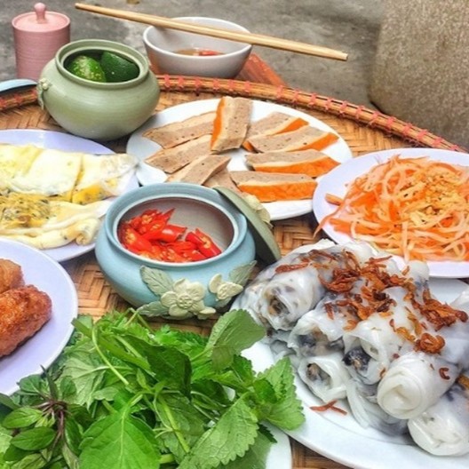 Vietnamese steamed rice rolls are a popular dish among gastronomes throughout the country. This dish is made of steamed rice batter filled with minced wood ear mushrooms, chopped onion, black pepper, and ground pork, topped with crispy fried shallots and Vietnamese sausage slices. Banh cuon is also served with dipping sauce, fresh cucumber slices, chopped lettuce, basil, and blanched bean sprouts. This dish could be enjoyed as a quick snack, a light meal, or a full-fledged main course.